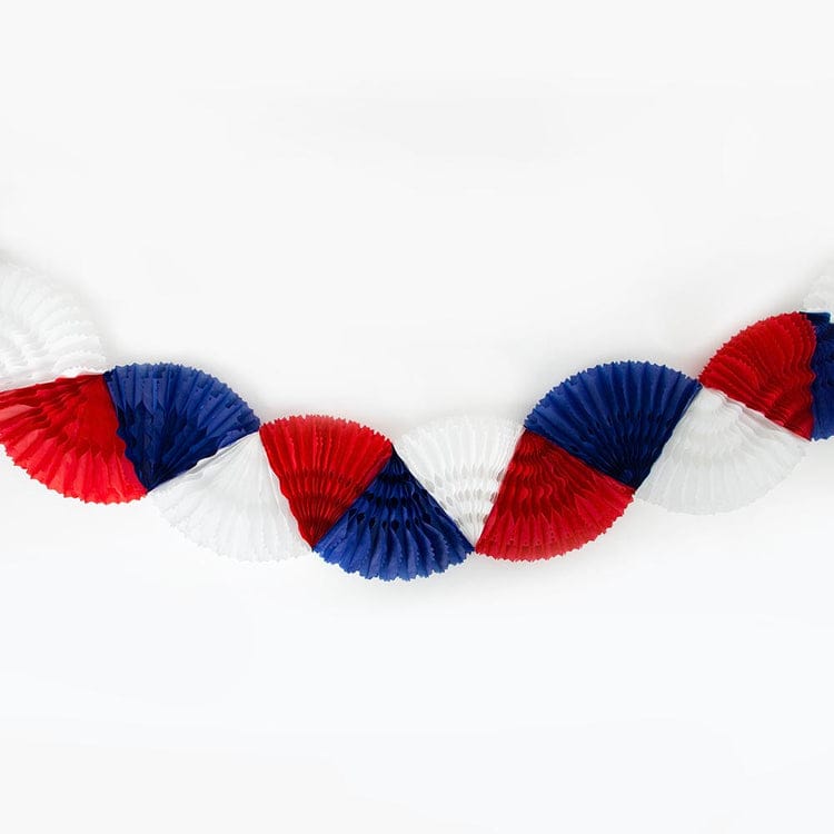 Skapa en festlig och färgstark dekoration med denna pappersgirlang i klassiska röd-, vit- och blå toner. Girlangen består av ihopsatta solfjädrar som ger ett dekorativt och voluminöst utseende.