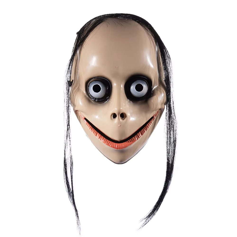 En riktigt obehaglig och creepy mask som garanterat väcker rysningar. Masken har ett stelt, kusligt leende, uppspärrade ögon och ett uttryck som känns både galet och skrämmande. Den är dessutom utrustad med lite svart plastigt hår, vilket förstärker den läskiga looken. Perfekt för Halloween, skräckteman eller när du vill skapa en riktigt störande effekt.