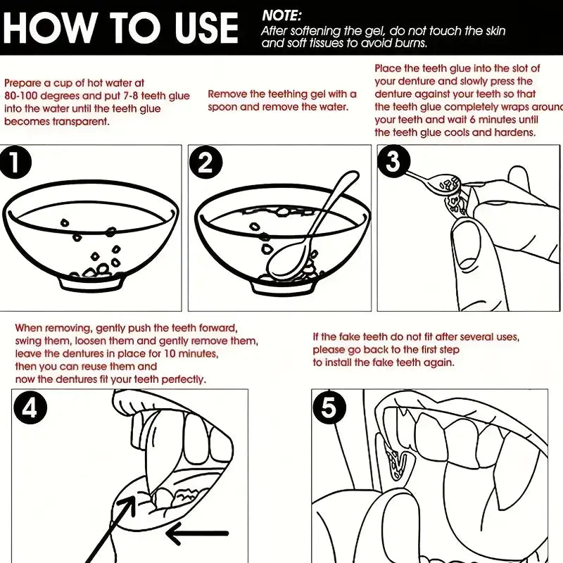 Använd en liten sked för att fylla materialet i protesens fästhålighet och tryck det mot dina riktiga tänder.