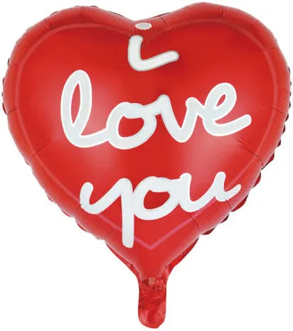 Detta är en stilren folieballong, formad som rött hjärta med text " i love you"