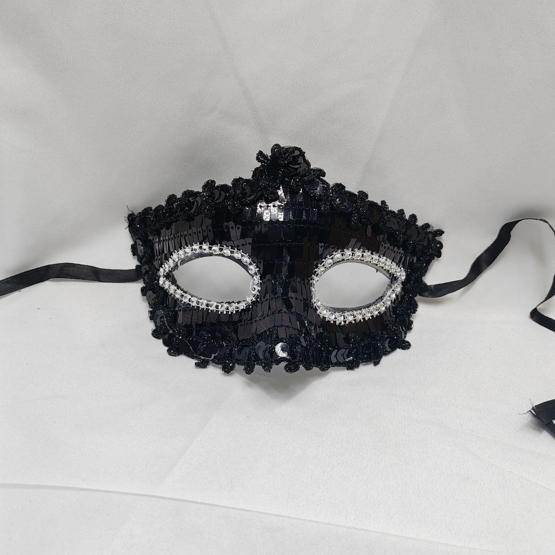 Skapa en mystisk och elegant look med denna venetianska mask med paljetter. Masken är rikt dekorerad med glittrande paljetter och har gnistrande kristaller runt ögonen som ger ett lyxigt intryck. Finns i rött, svart och guld, perfekta färger för maskerad, fest eller temaevenemang. En bekväm och iögonfallande accessoar som lyfter din outfit och garanterar uppmärksamhet.