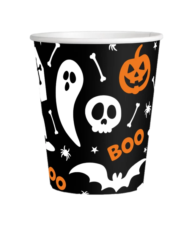 Servera drycken med stil på Halloweenfesten! Dessa pappersmuggar rymmer 210 ml och är dekorerade med läskiga Halloweenmotiv och texten “BOO”. Perfekta för både barn- och vuxenfester.