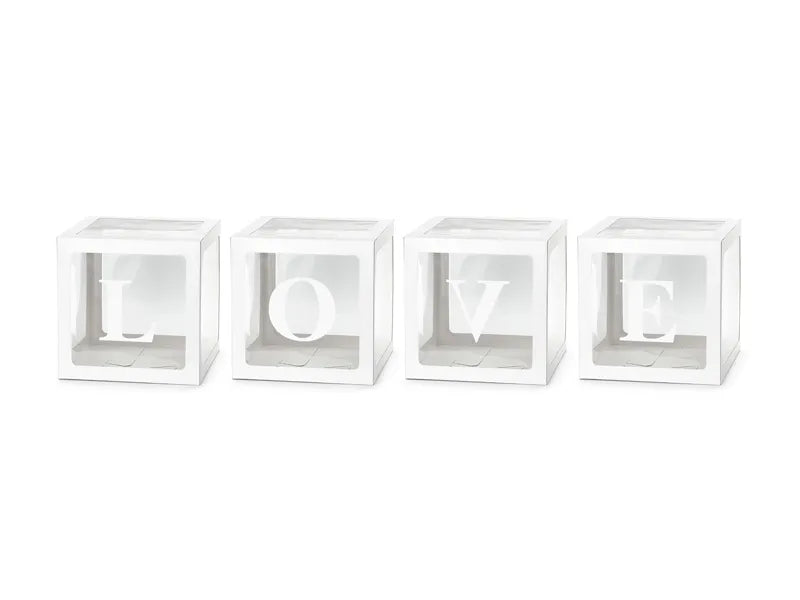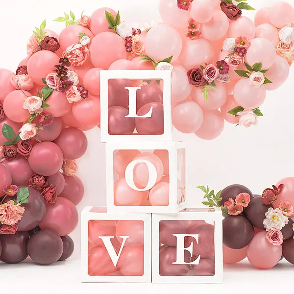 Skapa en romantisk och festlig dekoration med detta set om 4 ballongboxar med vita bokstäver som bildar ‘LOVE’! Perfekt för bröllop, alla hjärtans dag, jubileum eller romantiska fester. När de är ihopsatta mäter varje box ca 30 × 30 cm. Produkten är DIY, vilket gör det roligt och enkelt att montera själv.