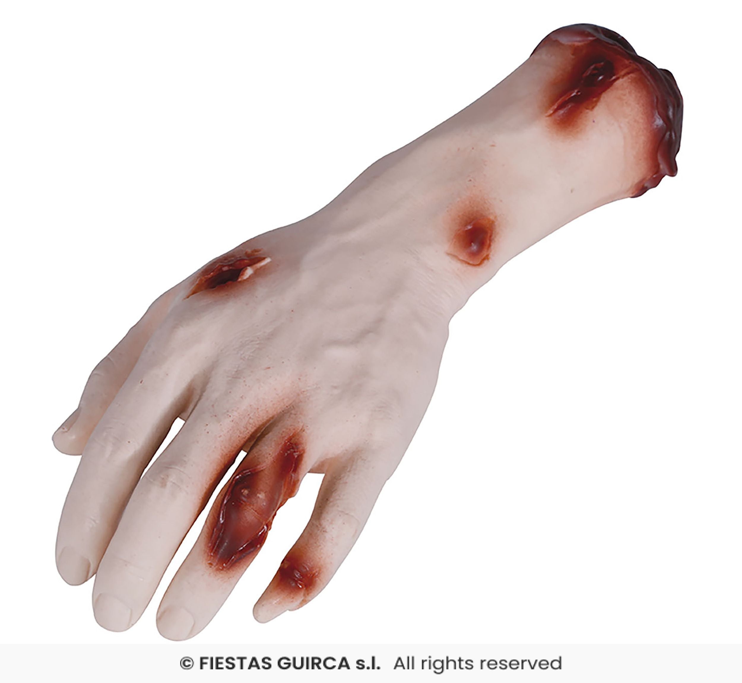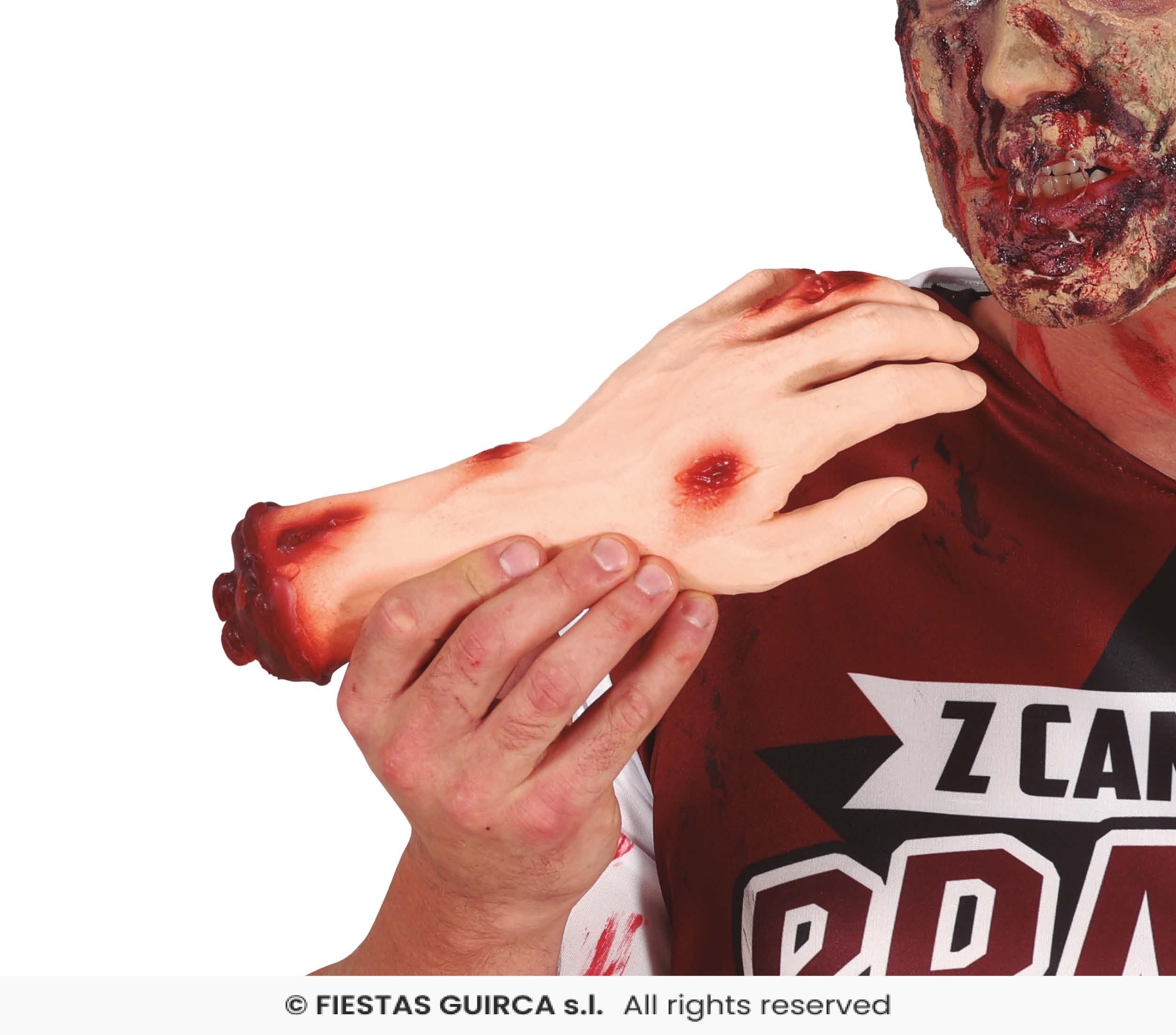 Skapa en riktigt skrämmande effekt på Halloween eller maskerad med denna avhuggna blodiga hand. Handens realistiska detaljer och blodiga finish gör den perfekt som dekoration eller rekvisita till skräckteman, teater eller film.