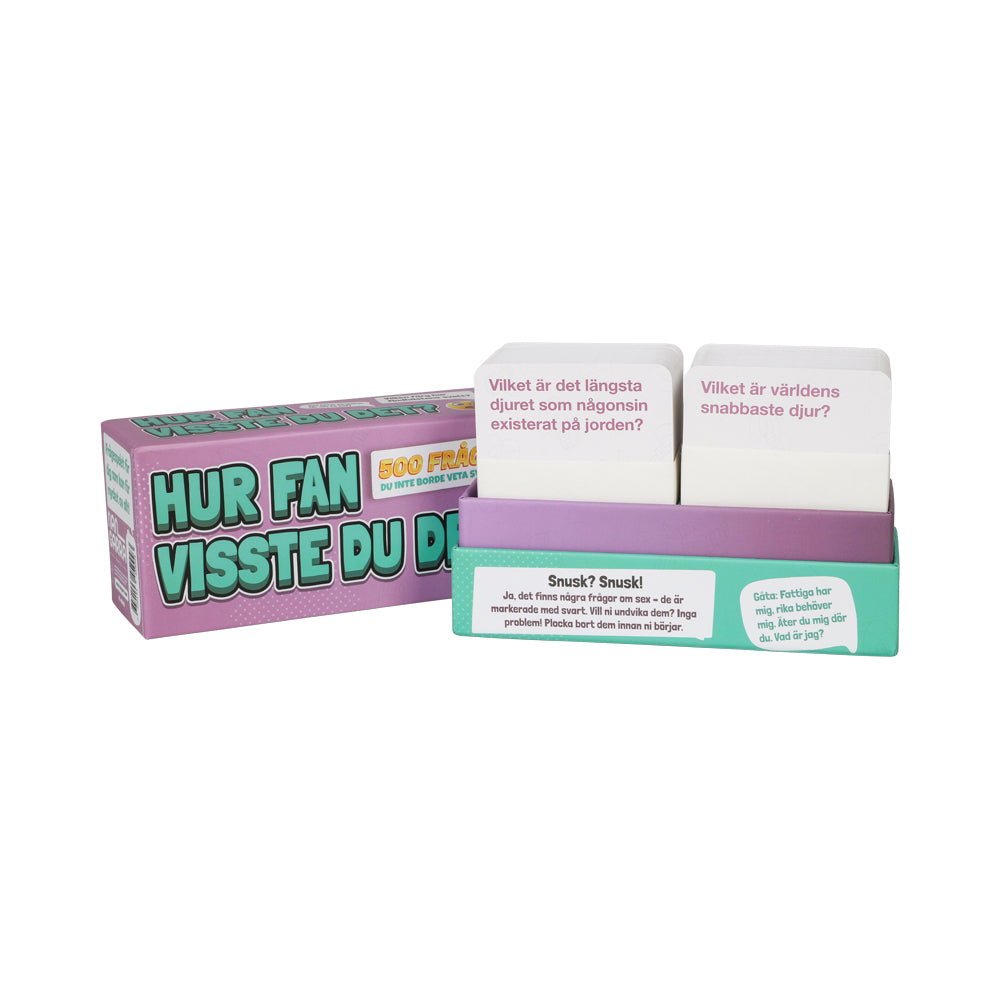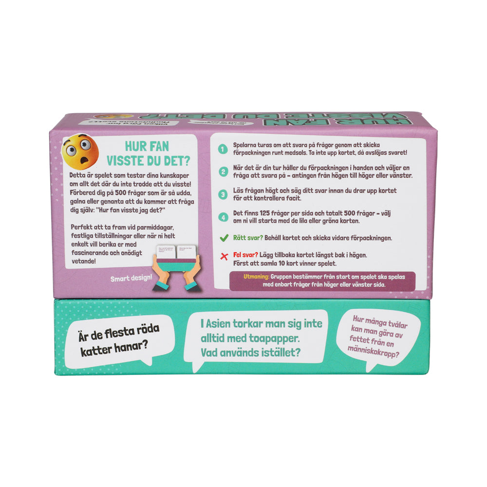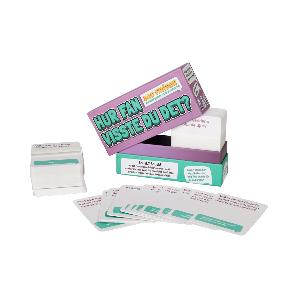 Utmana dina hjärnceller och förvåna både dig själv och andra med Hur fan visste du det? – Partyspelet där knasig kunskap regerar! Med 500 udda, roliga och oväntat pinsamma frågor bjuder spelet på skratt, överraskningar och ovärderligt (och totalt onödigt) vetande. Perfekt för parmiddagar, festliga kvällar eller när ni bara vill testa hur mycket konstig fakta ni faktiskt går runt och bär på.