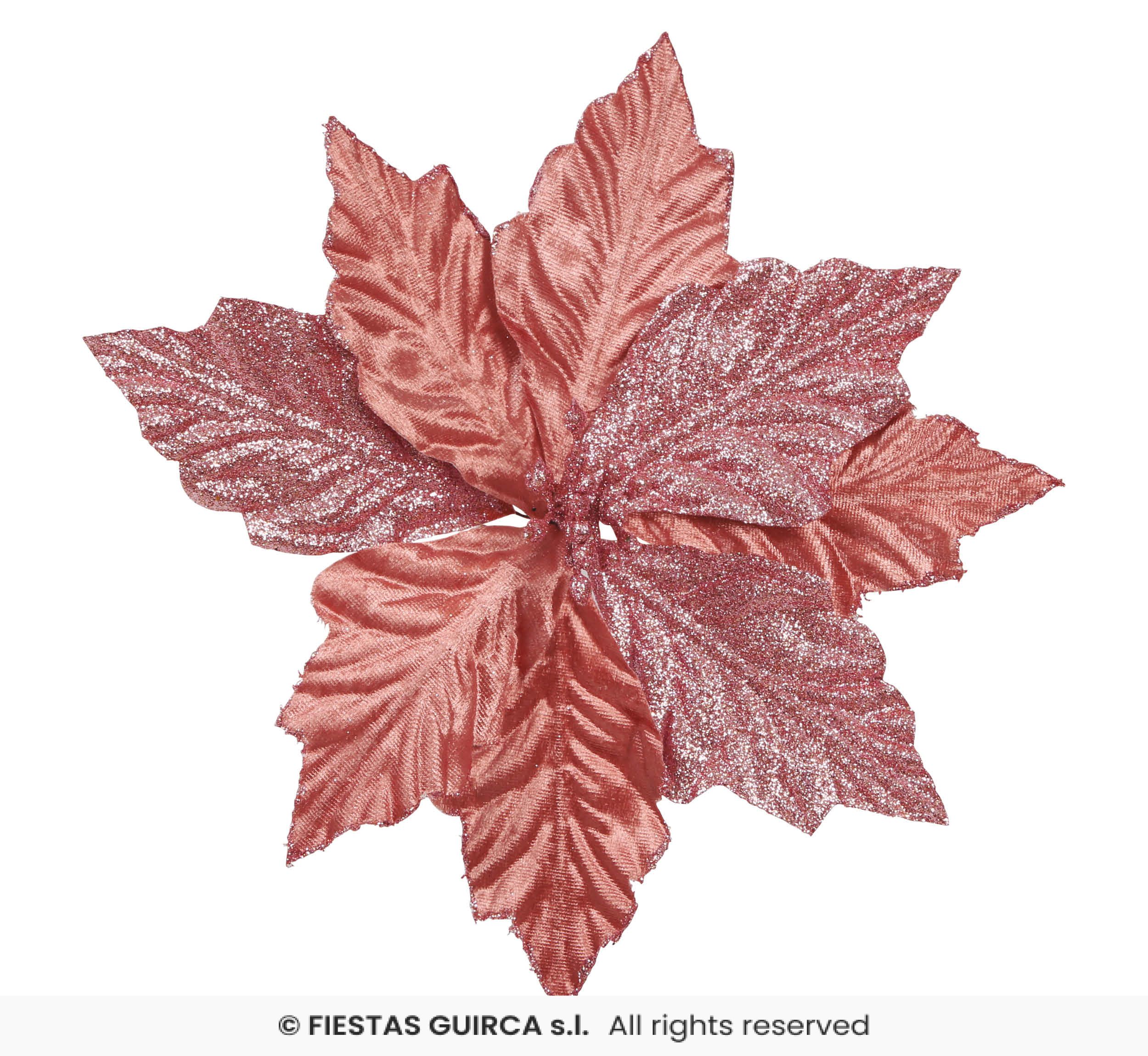 Elegant julblomma i roséton på pinne – idealisk för att dekorera blomsterarrangemang, julgrupper, kransar eller paket. Den skimrande ytan och de mjuka kronbladen ger en lyxig och festlig känsla till julens dekorationer.