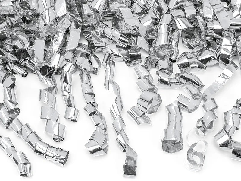 Skjuter ut långa silverfärgade metallic-streamers