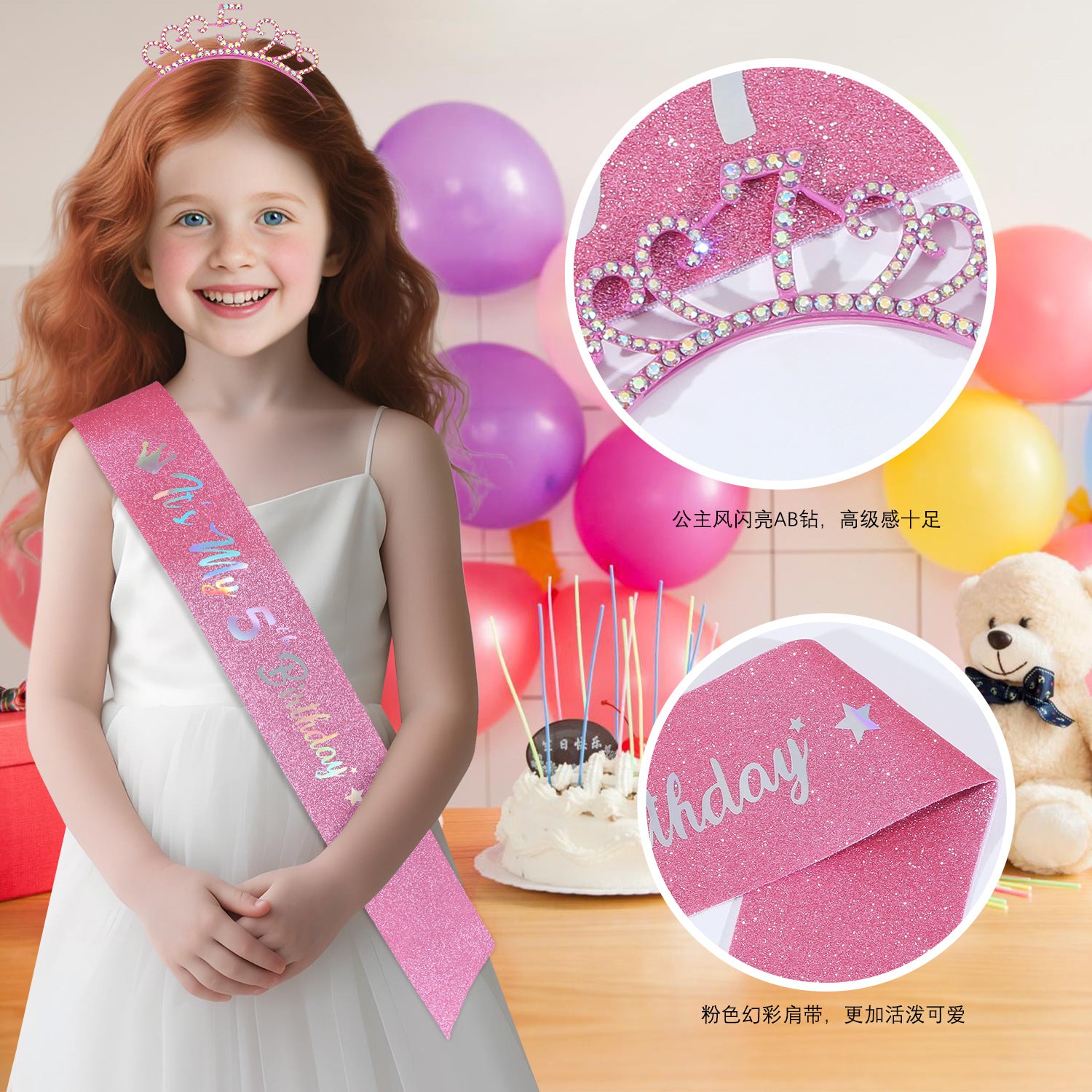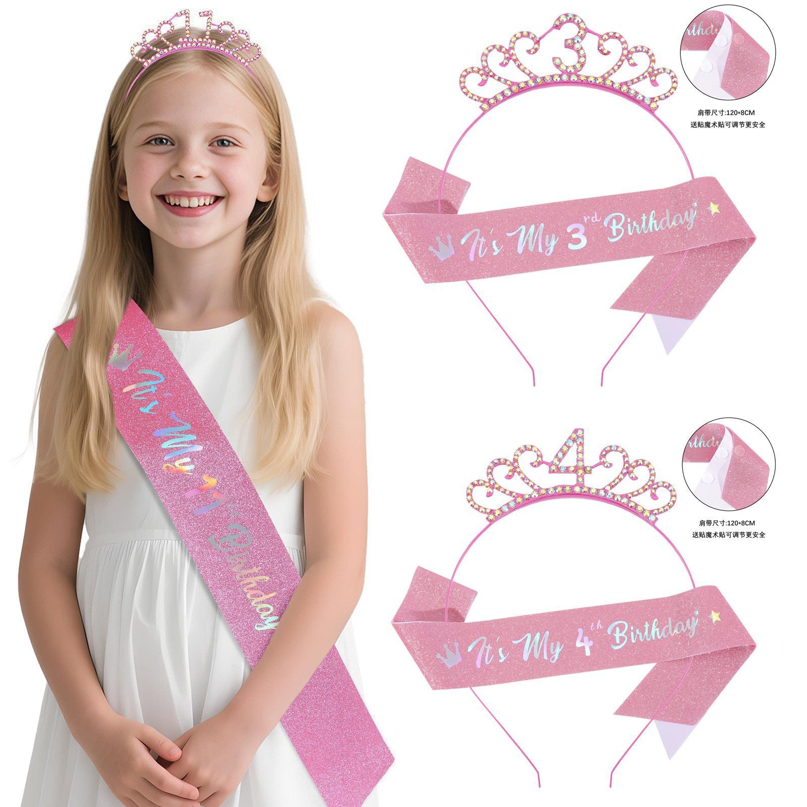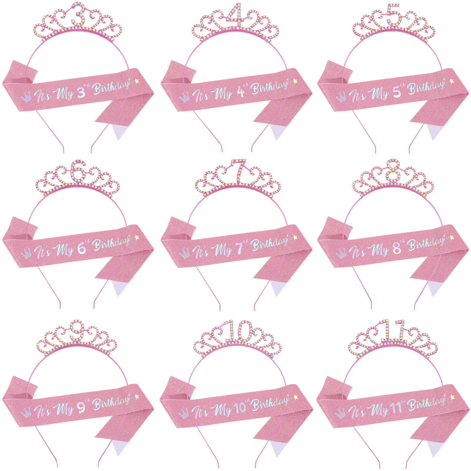 Fira födelsedagen med stil! Detta glittrande födelsedagsset består av ett rosa, skimrande ordensband med texten “It’s my …th Birthday” samt ett matchande rosa metall­diadem. Diademet är dekorerat med gnistrande kristaller som formar årtalet (3–11 år) och fortsätter i ett tiarainspirerat mönster för en extra magisk känsla. Ett perfekt set för att låta födelsedagsbarnet känna sig som dagens stjärna!