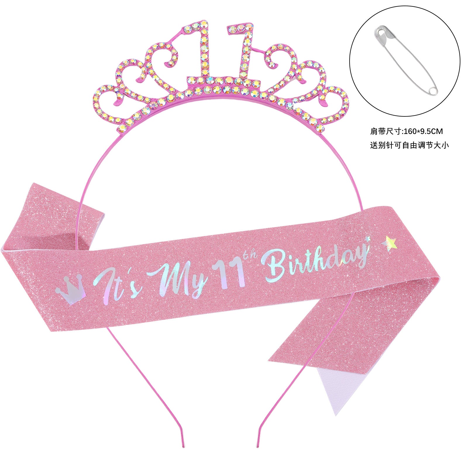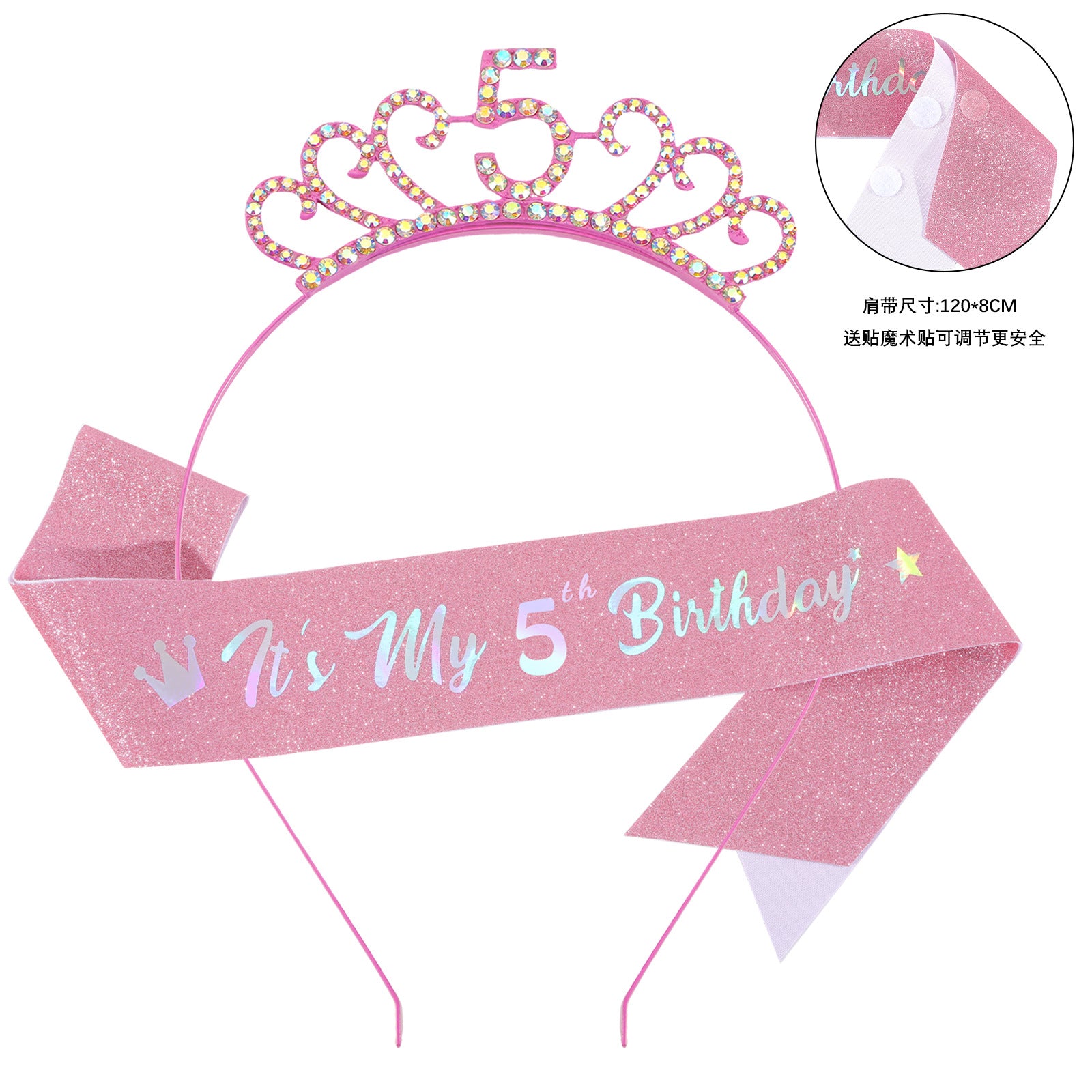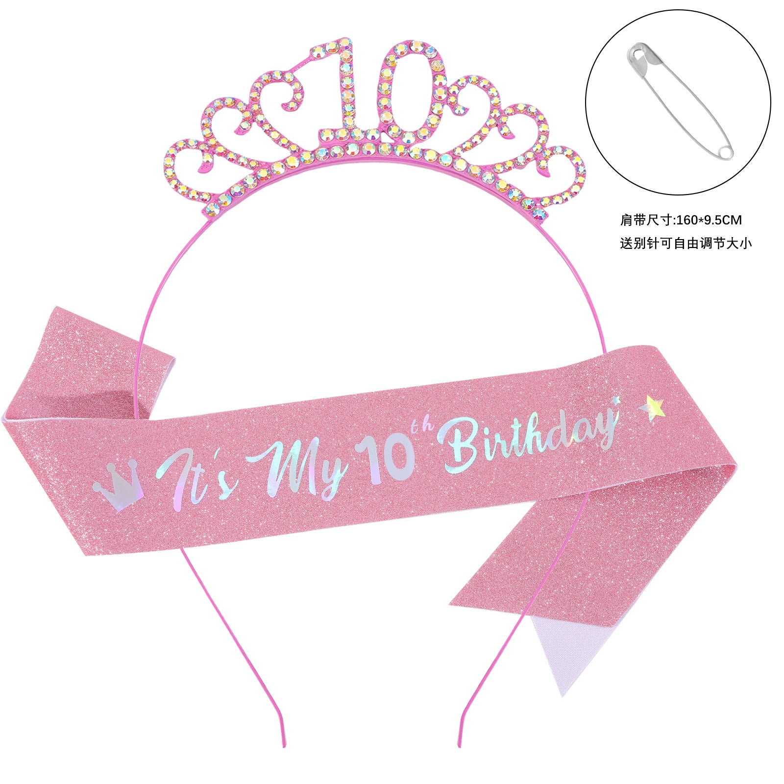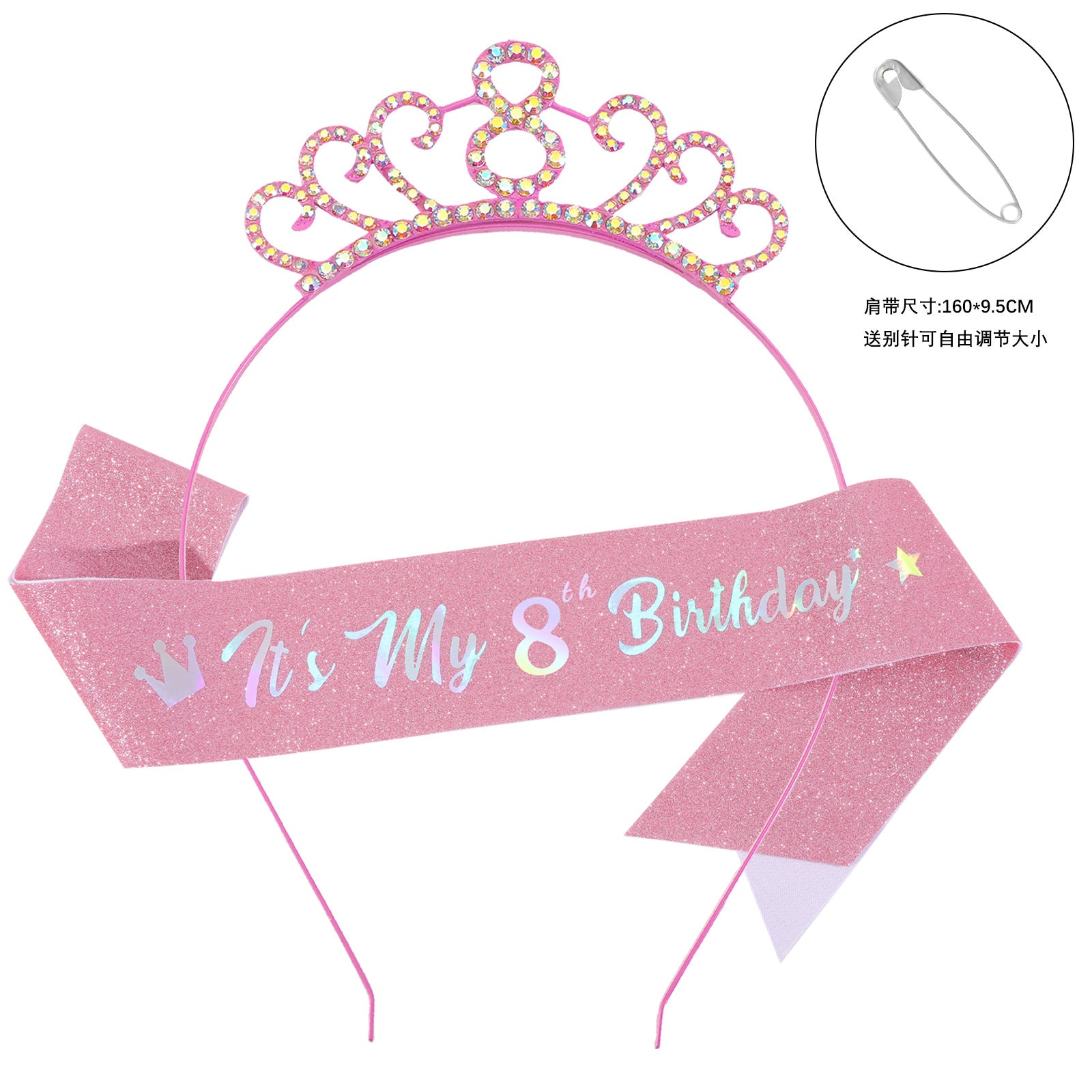 Fira födelsedagen med stil! Detta glittrande födelsedagsset består av ett rosa, skimrande ordensband med texten “It’s my …th Birthday” samt ett matchande rosa metall­diadem. Diademet är dekorerat med gnistrande kristaller som formar årtalet (3–11 år) och fortsätter i ett tiarainspirerat mönster för en extra magisk känsla. Ett perfekt set för att låta födelsedagsbarnet känna sig som dagens stjärna!